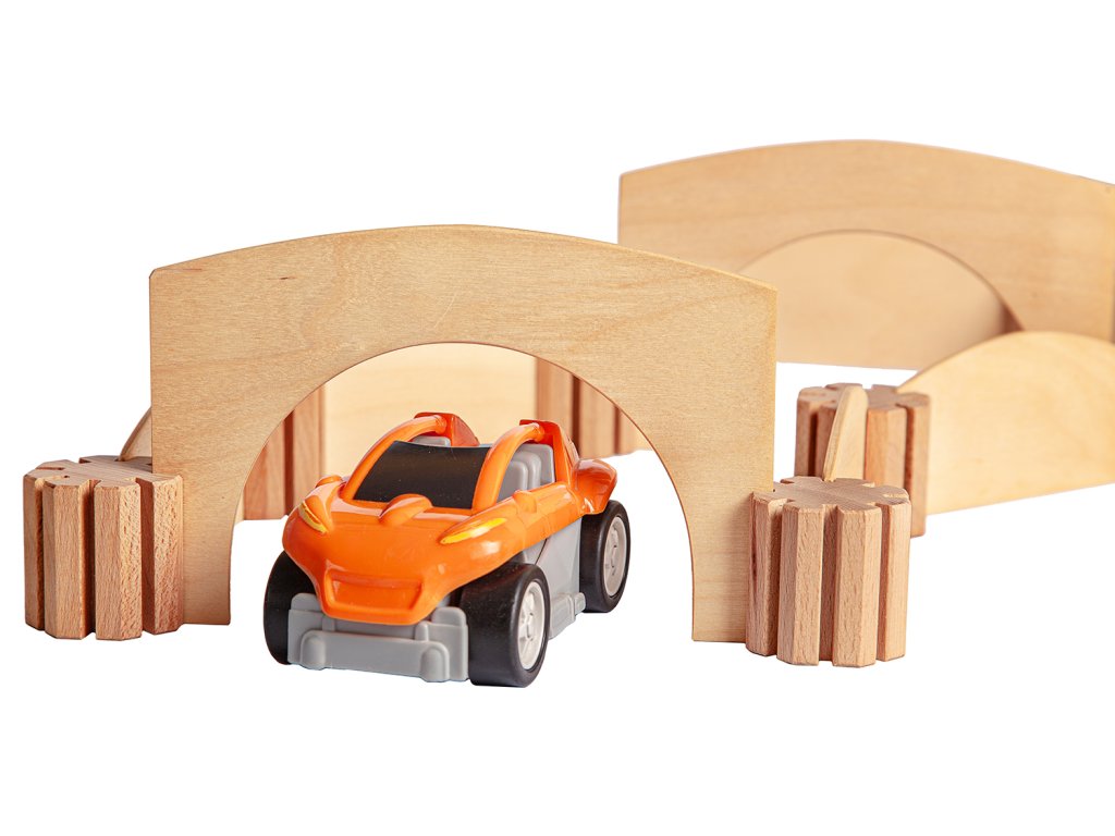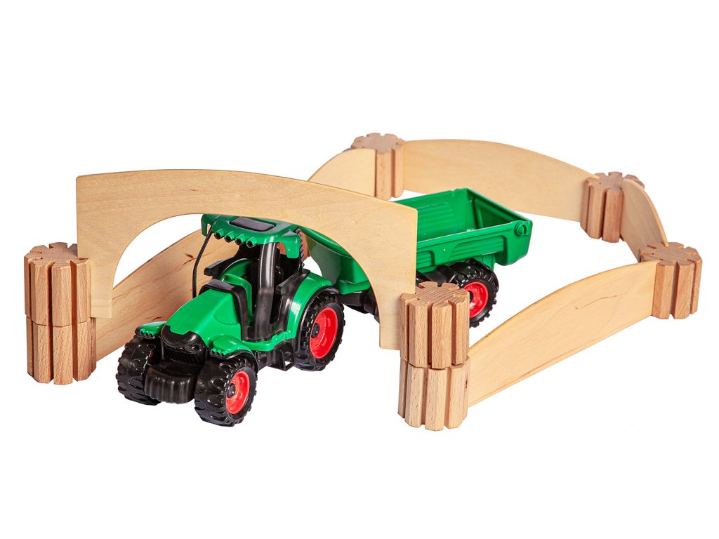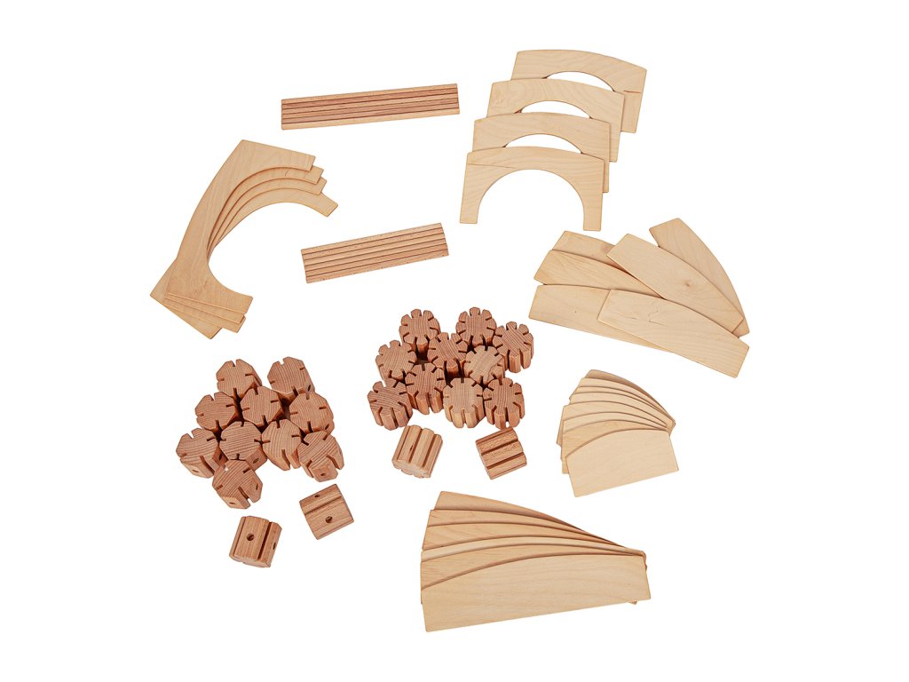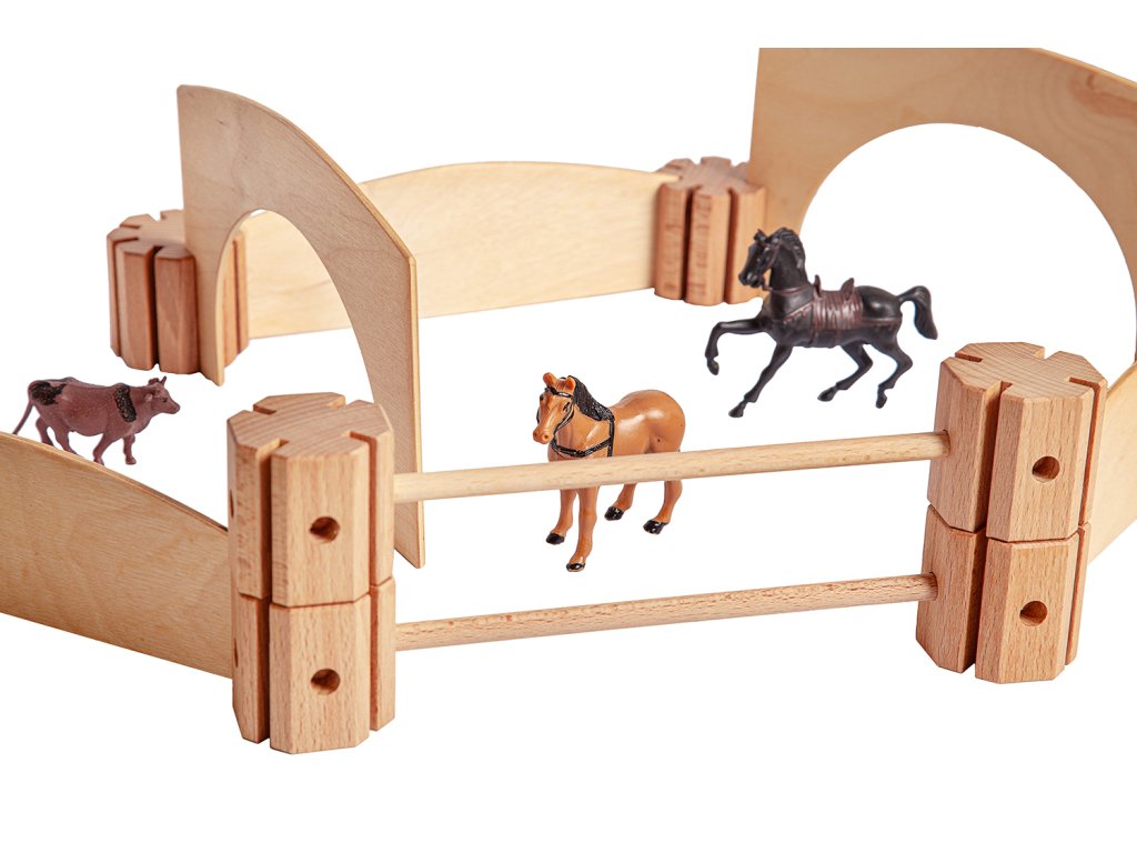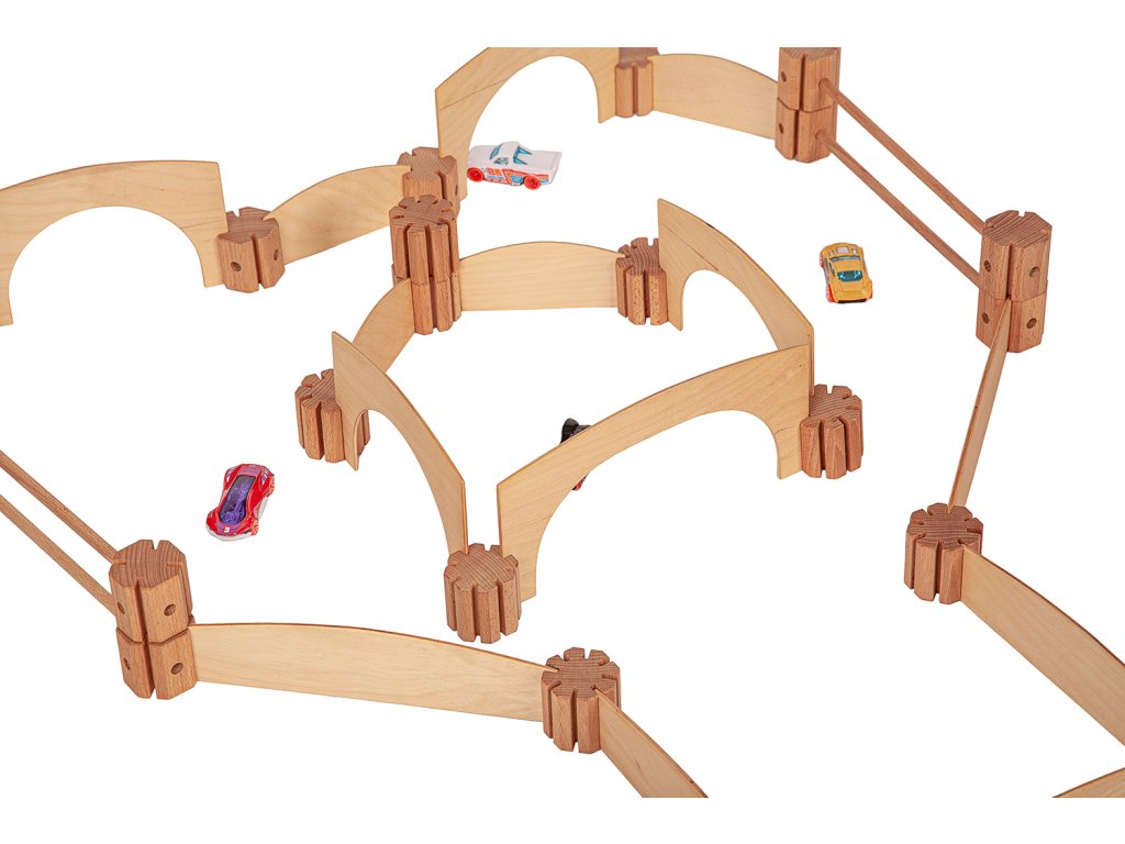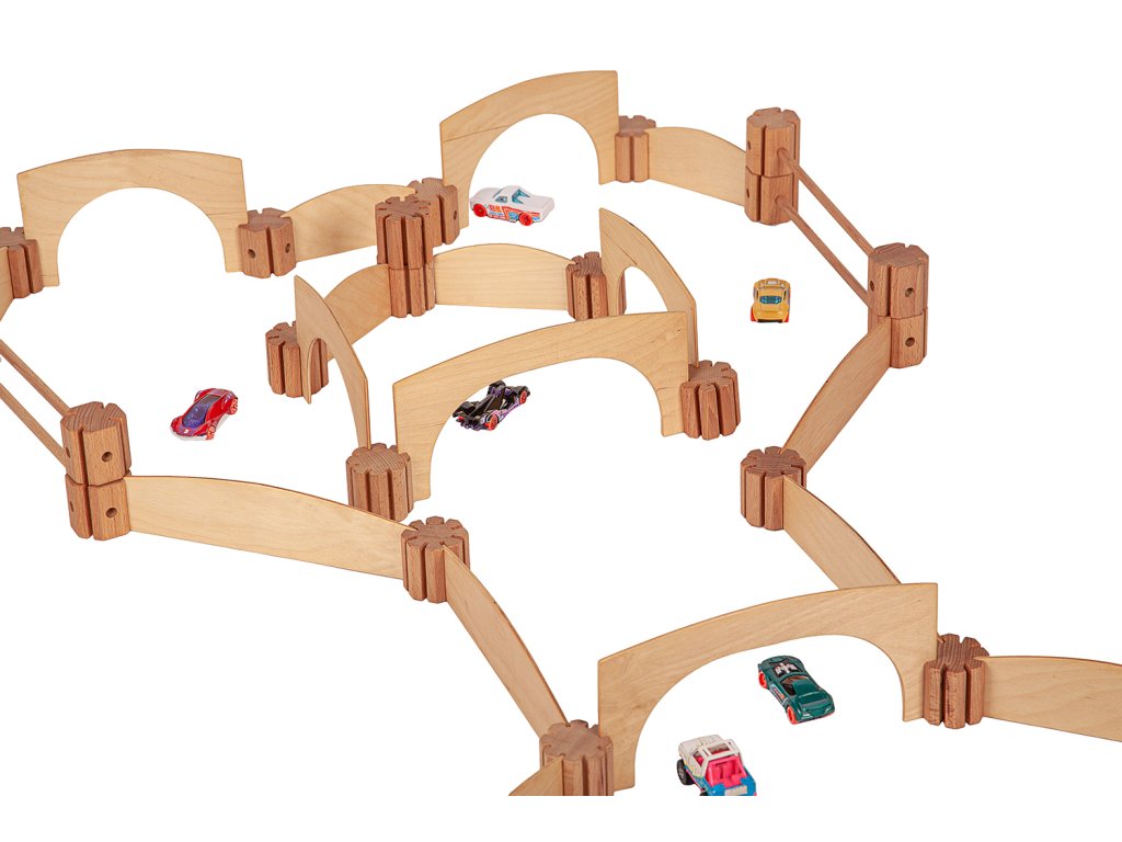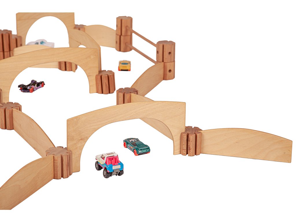 Dřevěná kreativní spojovací stavebnice. Spojuj a vytvoř si dráhu, ohradník, mosty, garáž, kuličkodráhu, město...Fantazii se meze nekladou.